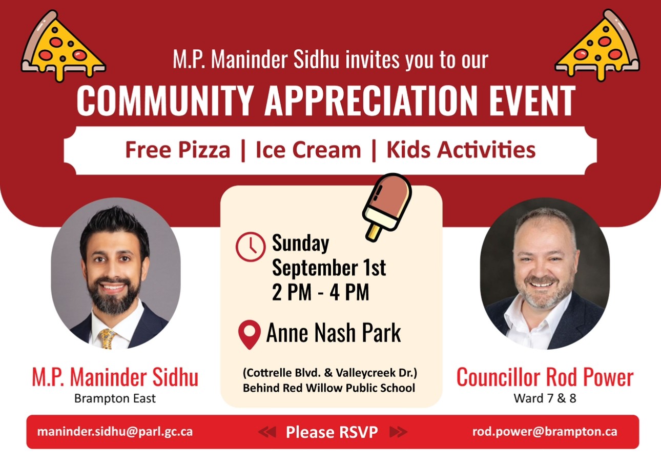 Brampton East Member of Parliament, Maninder Sidhu is organizing a special Community Appreciation Picnic, an event designed to celebrate the vibrant community spirit and recognize the invaluable contributions of the Brampton East community. This picnic is a gesture of gratitude for the hard work and dedication that community members have shown in making Brampton East a better place for everyone.