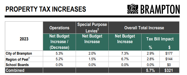 This Brampton tax hike is compounded by the Region of Peel’s 4.5% increase, which will raise the typical residential property tax bill by $247 and the commercial/industrial property tax bill by $435.