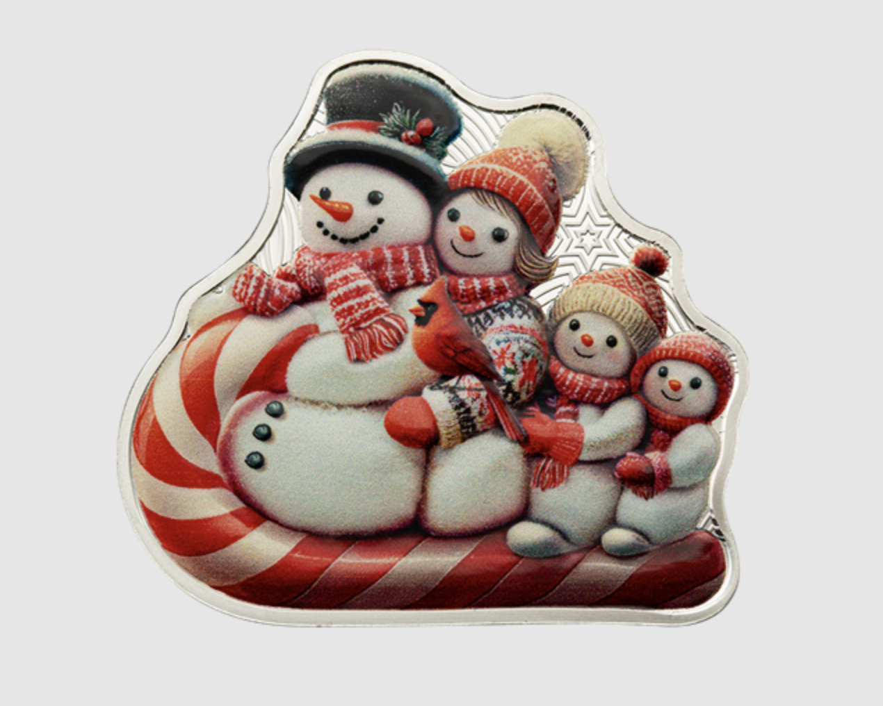 The coin features a whimsical, ornament-shaped design depicting a cheerful snowman family gliding down a snow-covered hill on a candy cane–striped sled. Struck from one ounce of 99.99 per cent pure silver, it comes housed in a custom, ornament-style capsule that allows it to be easily hung on a Christmas tree.